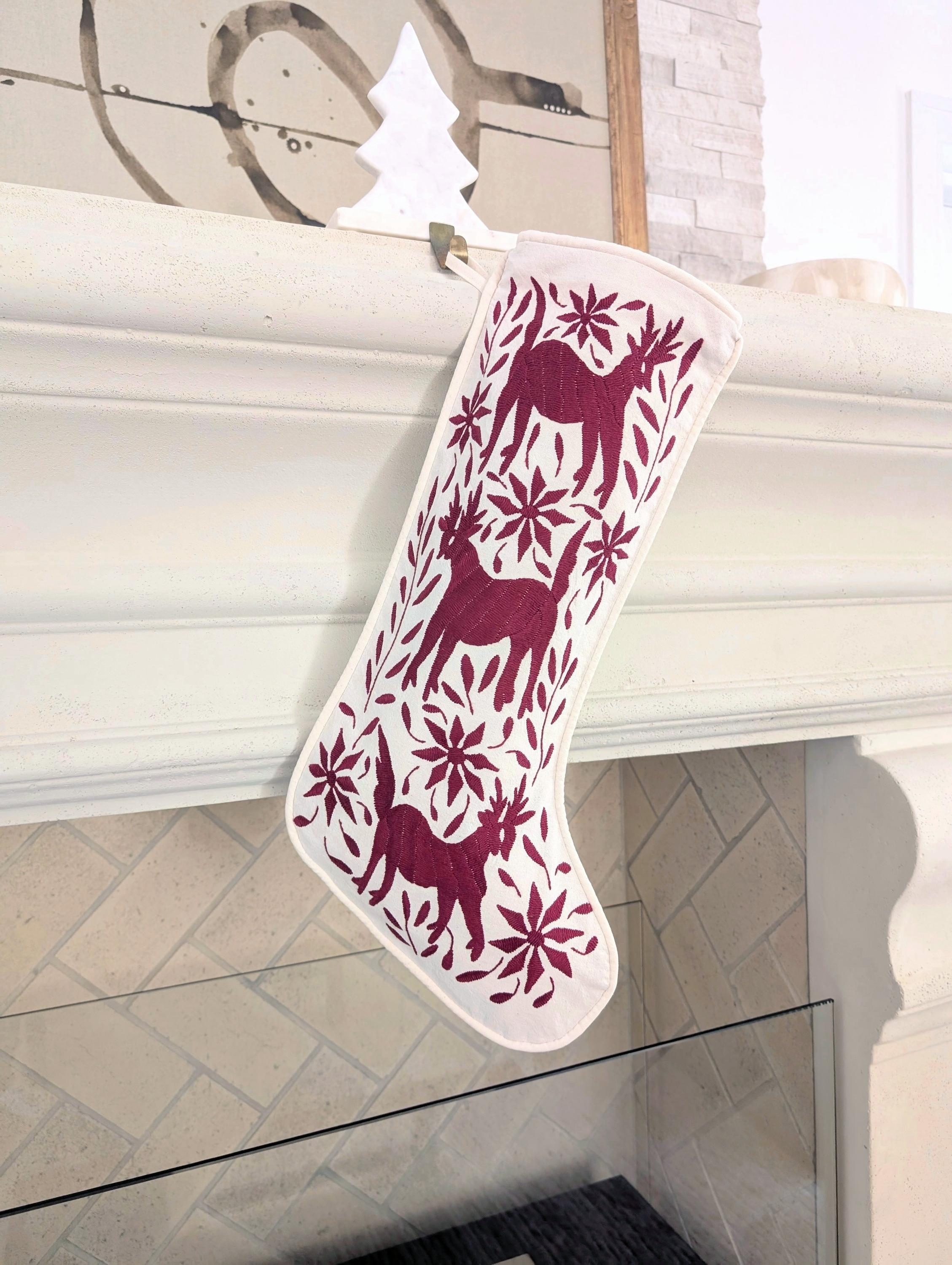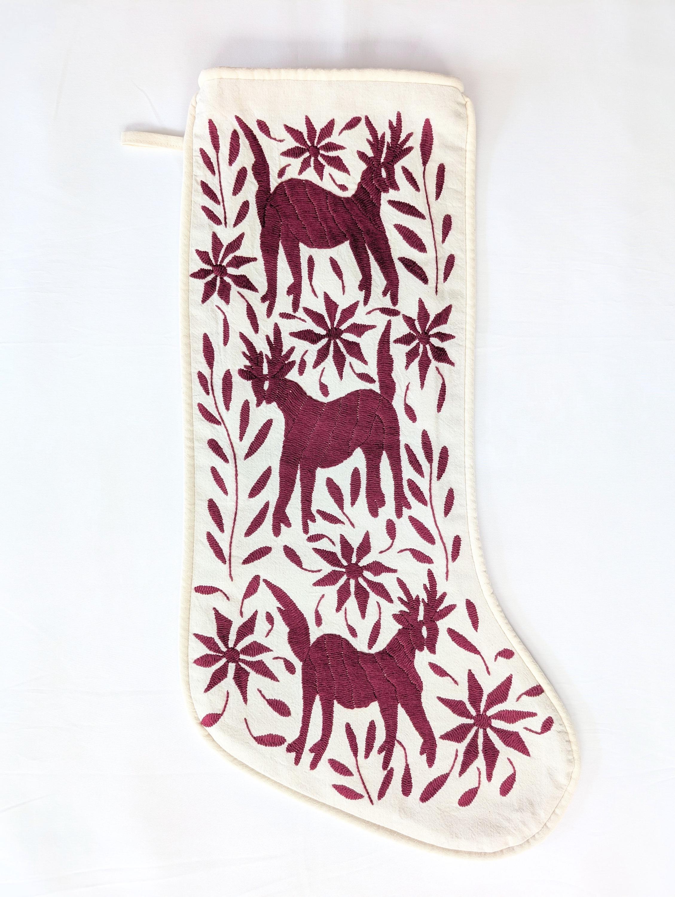 This one-of-a-kind Otomi hand embroidered Christmas Stocking is crafted by skilled Otomi artisans in México.